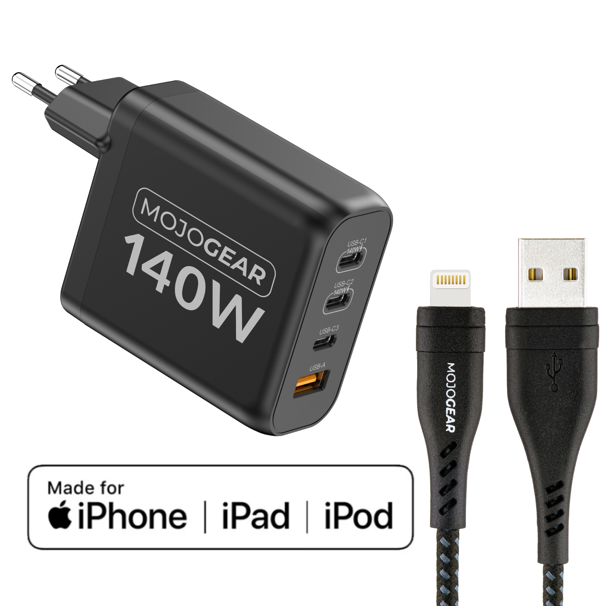 Laad al je Lightning apparaten razendsnel op met deze voordelige CHARGE+ combo. De set bestaat uit de compacte CHARGE+ 140W oplader en een extra stevige USB naar Lightning kabel van 1,5 meter lang. Deze set is ideaal voor het opladen van iPhone of iPad.