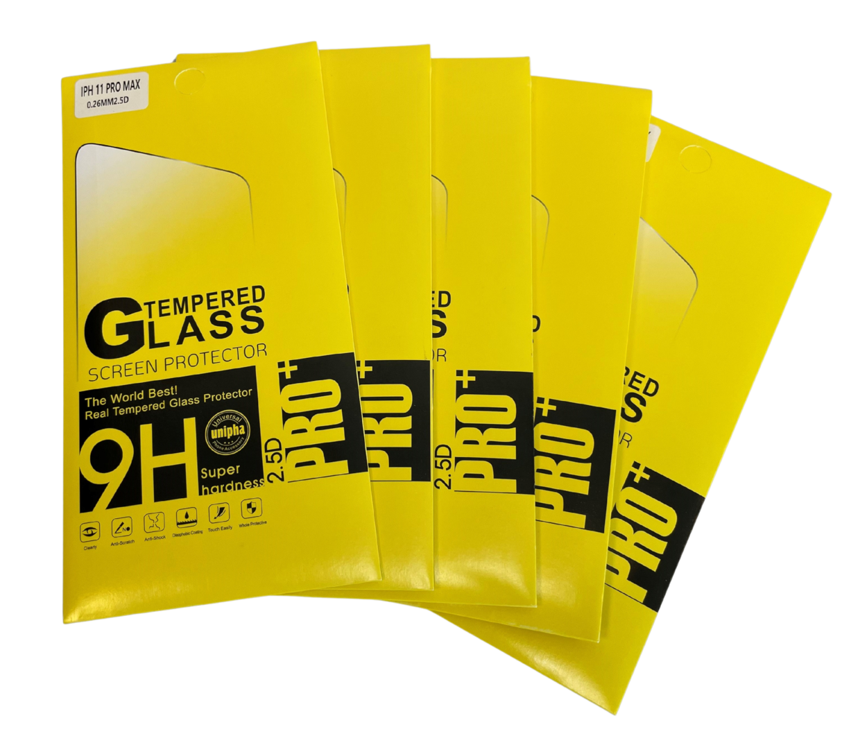 Tempered Glass Hardheid 9H Geschikt voor iPhone 11 Pro Max. Een verpakking bevat vijf screenprotectors.