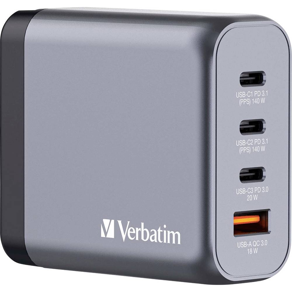 In de 140 Verbatim gaN-oplader zijn twee USB-C PD 140 W-aansluitingen, een USB-C PD 20 W-aansluiting en een USB-A QC 3.0-aansluiting in een slank, recht…